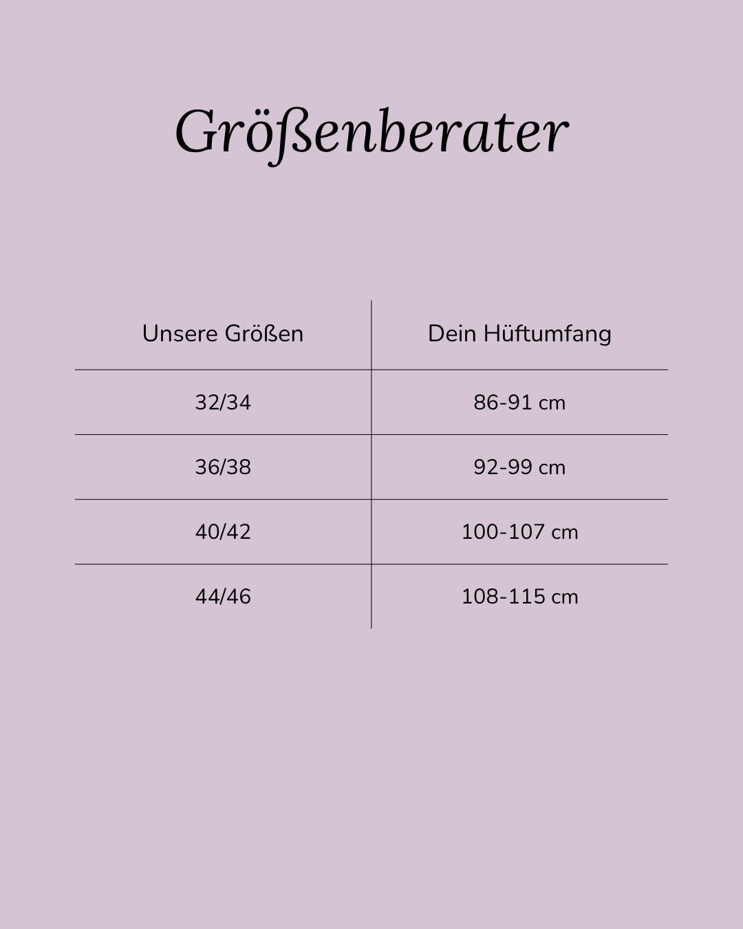 Das Obermaterial ist sehr elastisch und schneidet nicht ein, dank der nahtlosen Verarbeitung an Bein und Bauch. Wir haben uns für Doppelgrößen entschieden, da das Material sich perfekt an dich anpasst und nicht umgekehrt. Merke dir einfach deine "normale" Konfektionsgröße vor und wir sorgen dafür, dass du den perfekten Slip bekommst.